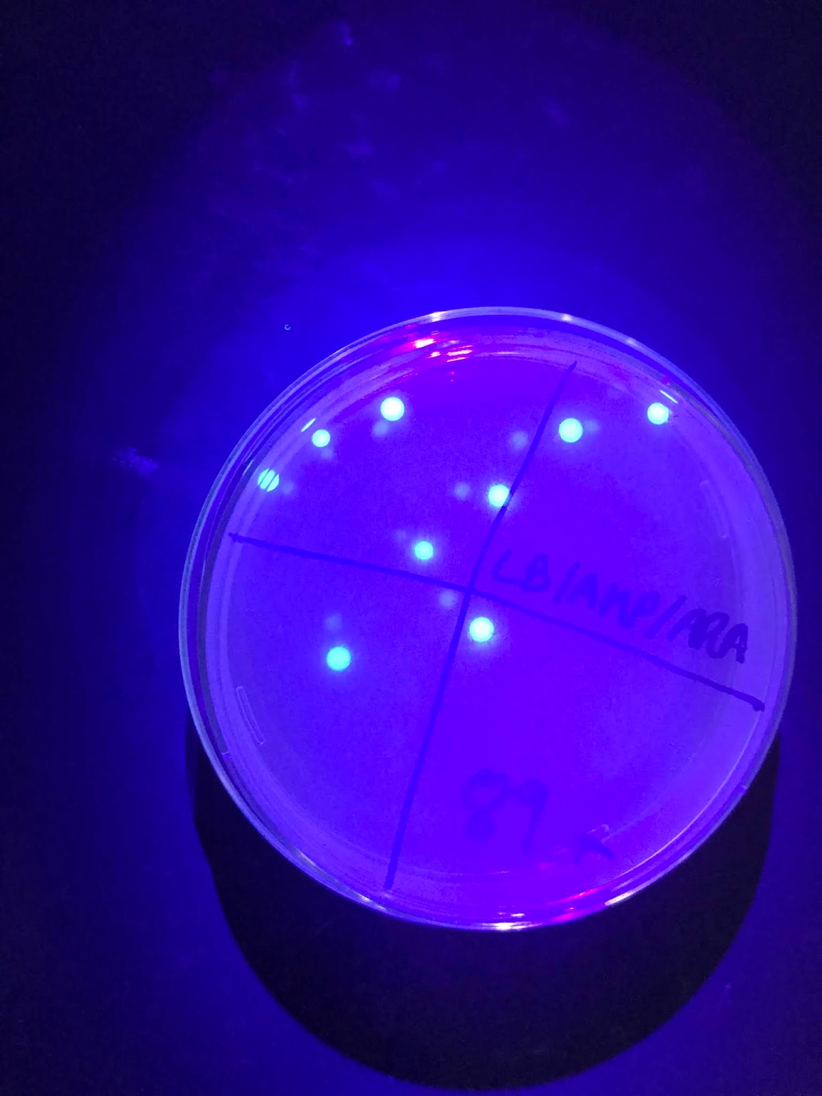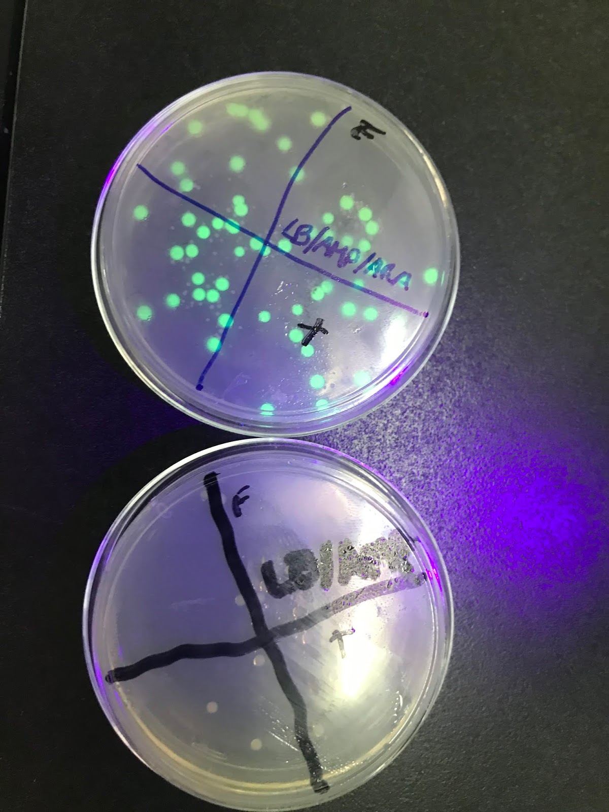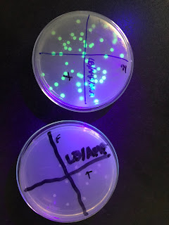 Y por último observamos que se han transformado las bacterias, ya que crecen en el medio con antibióticos. Pero para que se exprese el gen debe haber arabinosa en el medio