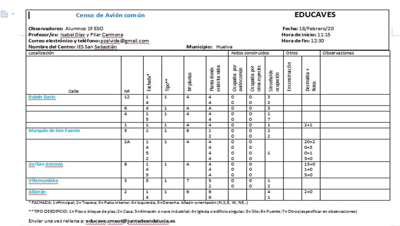 Los alumnos de 1º de ESO y 1º de Bachillerato realizan un censo de nidos de avión común Delichon urbicum. Se inicia en Noviembre y se continúa hasta Febrero, que ya se espera que comenzarán a volver los individuos. Por lo que el estudio se continuará para comprobar los nidos censados que están ocupado.